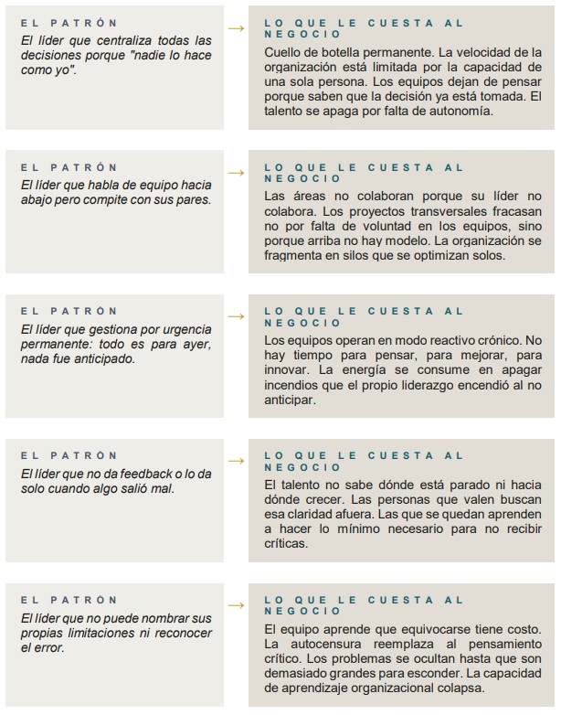 Lo que sigue no es una descripción abstracta de estilos de liderazgo. Es un mapeo de los patrones más frecuentes que hemos visto en organizaciones de distintos sectores y contextos, y su traducción directa al impacto en el negocio.