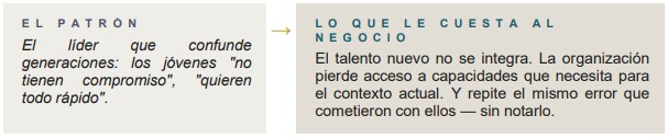 Ninguno de estos patrones es intencional. Todos son costosos. Ytodos tienen la misma raíz: líderes que llegaron a posiciones dealta responsabilidad sin haber desarrollado las capacidades que esas posiciones requieren.